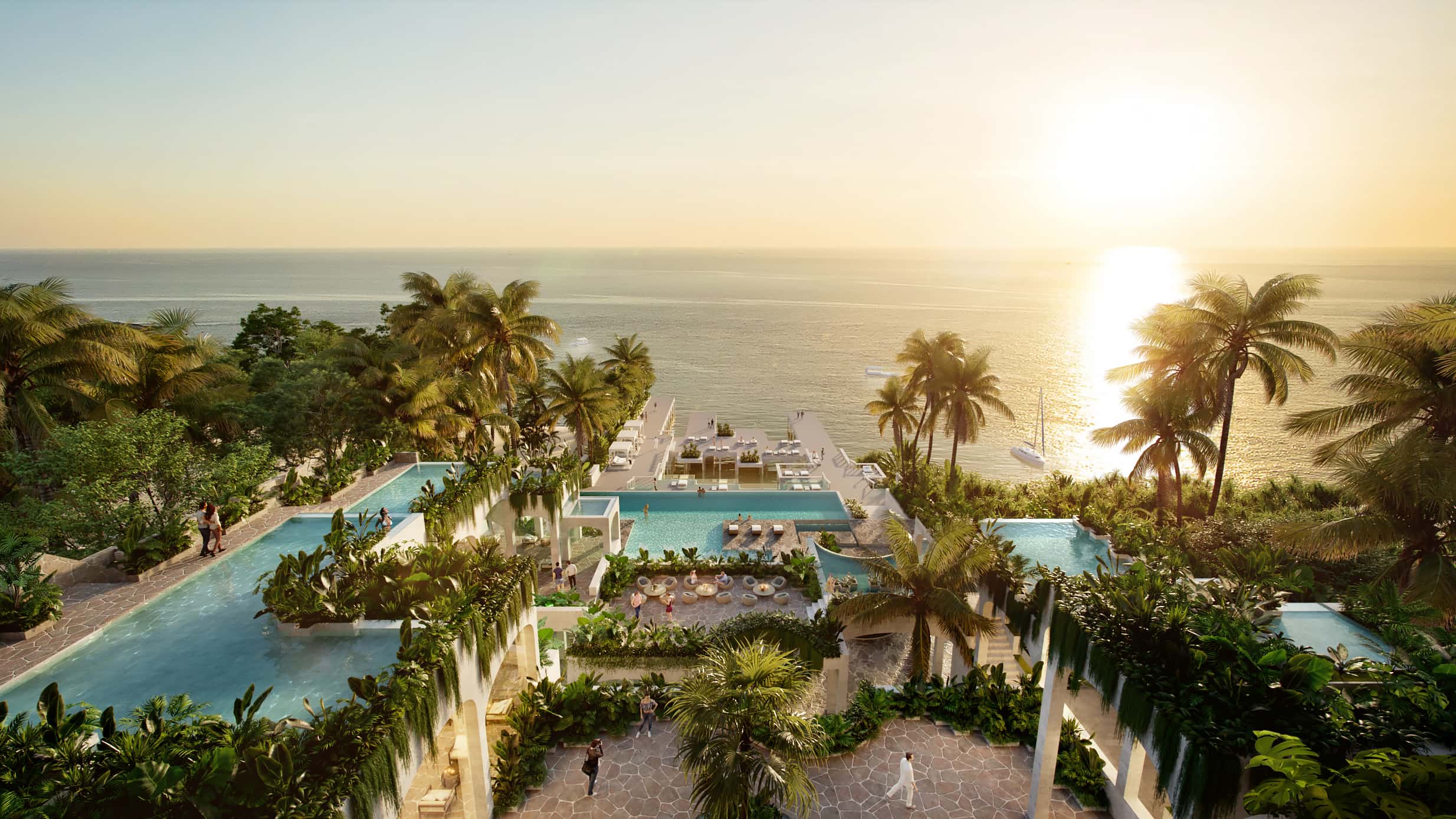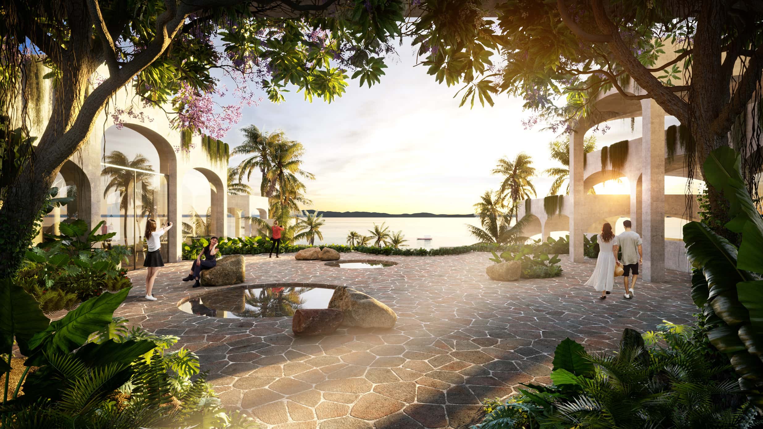 Arched colonnades recall ancient archaeological structures rooted in the jungle and frame soaring arcades amidst the landscape. Multi-level terraces and water basins offer private and intimate areas for gatherings. Linear piers extend into the sea and like fingers that lightly straddle the tides, with the ocean stretching to the horizon.